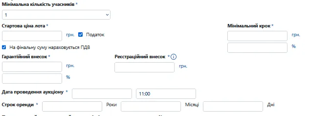 - Дата проведення аукціону - визначається організатором самостійно. Мінімальний термін від дати публікації до аукціону 7 календарних днів.