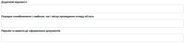 - Порядок ознайомлення з майном, час і місце проведення огляду об’єкта - вказуються організатором (поле не обов’язкове).