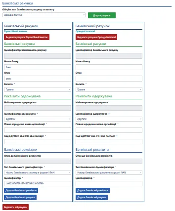 В блоці рахунків потрібно буде заповнити всі обов’язкові поля (позначені зірочкою). Дані рахунки будуть автоматично підтягуватись при формуванні Вами аукціону.