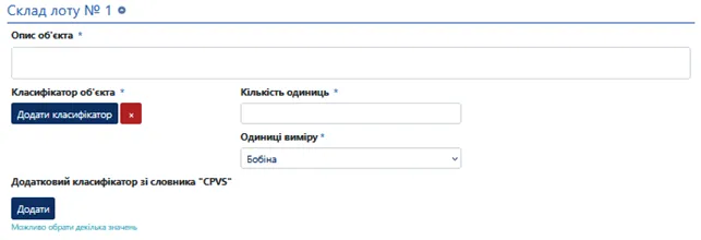 - Номер лоту - Номер лоту обирає Організатор, мінімальна кількість символів три. Рекомендуємо присвоювати унікальні номери лоту, наприклад у форматі «код ЄДРПОУ замовника/порядковий номер лоту – 25158707/3»