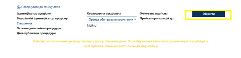 - Завантаження документів та публікація аукціону:
