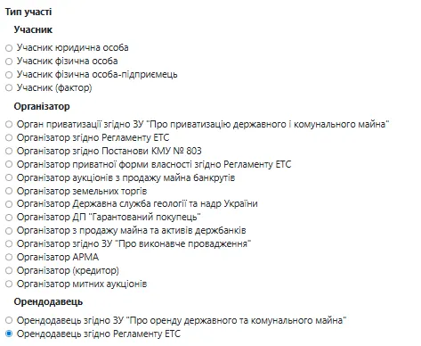 У вкладці «Учасник» Вам потрібно обрати тип участі «Орендодавець згідно Регламенту ЕТС»