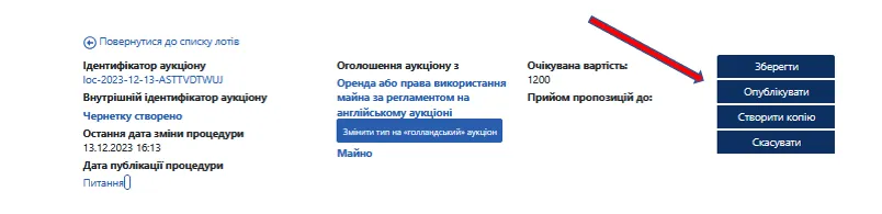 - Після завантаження документів натисніть кнопку «Опублікувати», аукціон буде опубліковано в електронній торговій системі.