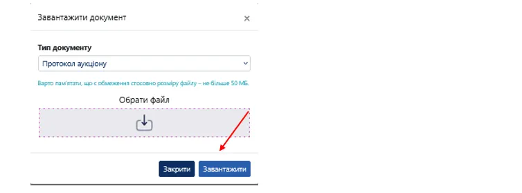 Після натискання кнопки у Вас з’явиться діалогове вікно для завантаження. Тип документу за замовчуванням Протокол аукціону. Оберіть необхідний Вам файл та натисніть кнопку «Завантажити».