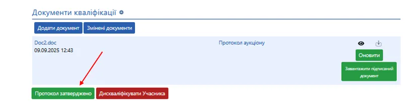 Після завантаження документу натисніть кнопку «Протокол затверджено», статус аукціону автоматично перейде в Очікується підписання договору.