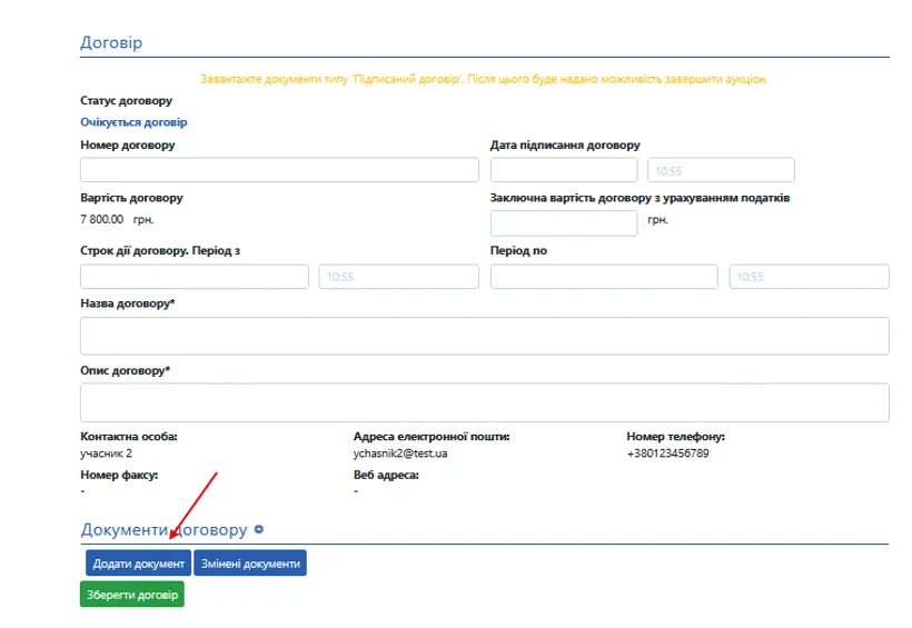 Через кнопку «Додати документ» оберіть файл договору та завантажте його під типом Підписаний договір.