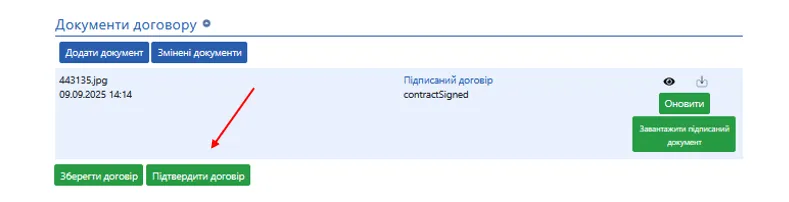 Після збереження необхідно підтвердити договір через відповідну кнопку.