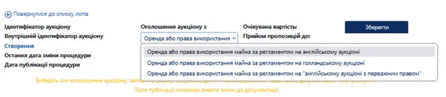 З випадаючого списку «Оголошення аукціону з» оберіть: